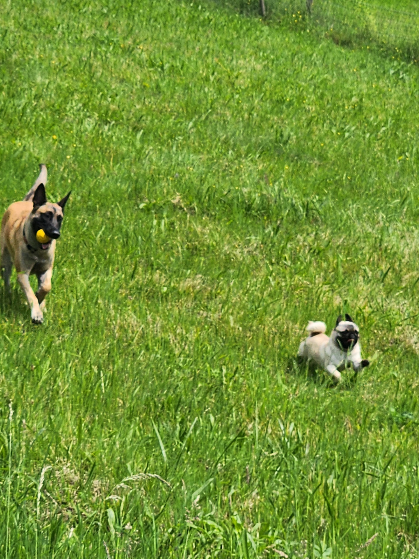 Notre élevage de chiens Carlin se situe en zone rurale. Les bébés apprennent à connaître l'intérieur et l'extérieur de la maison, le chenil, apprennent rapidement la propreté. Sont très tôt sociabilisés aux bruits int. et ext. Connaissent les déplacements en voiture...et je leur offre bien d'autres expériences à vivre afin qu'ils se sentent partout à l'aise.